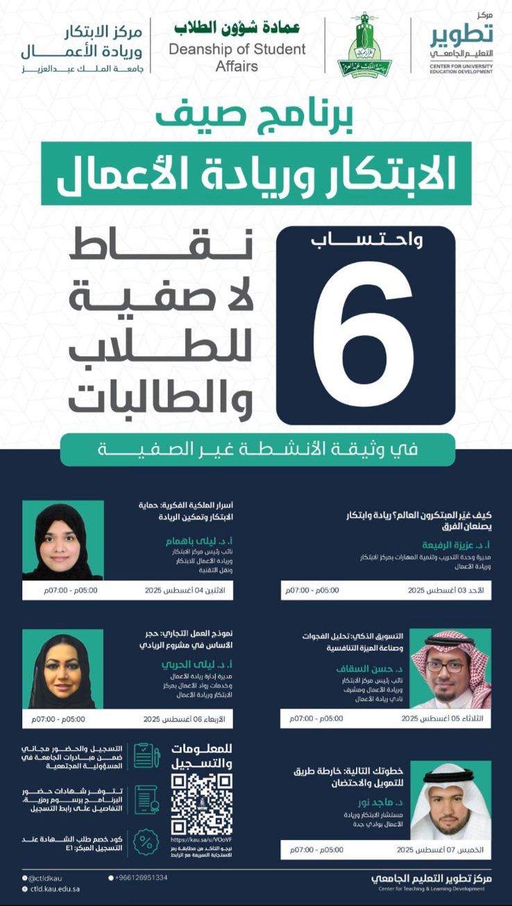 برنامج صيف الابتكار وريادة الأعمال هو مبادرة تدريبية نوعية تهدف إلى تطوير مهارات الطلاب والخريجين في مجالات الابتكار والريادة، مما يتماشى مع احتياجات سوق العمل المستقبلي. يُقدم البرنامج من قبل مركز الابتكار وريادة الأعمال بجامعة الملك عبدالعزيز بالشراكة مع عمادة شؤون الطلاب ومركز تطوير التعليم الجامعي